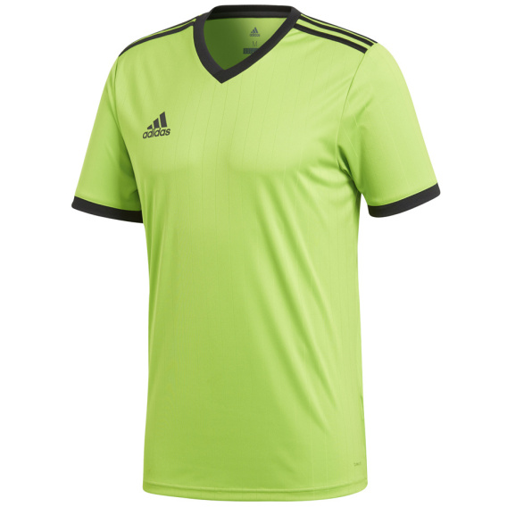 Dziecięca koszulka adidas Tabela 18, zielona, z technologią Climalite, zapewnia suchość i komfort dzięki skutecznemu odprowadzaniu wilgoci. Klasyczny krój RegularFit z dekoltem w serek i logo jest idealny na mecze i treningi.