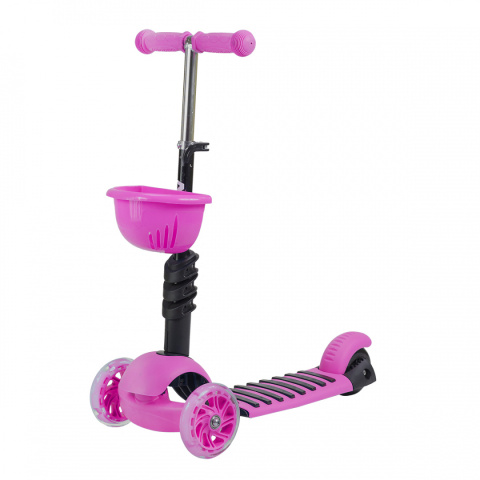 Model wyposażony jest w siedzisko z możliwością regulacji na trzech poziomach. Zakładając je zyskujemy chodzik dla najmłodszych użytkowników. Po odczepieniu siedziska pojazd zamienia się w hulajnogę, zaś po odczepieniu kierownicy staję się deskorolką.
