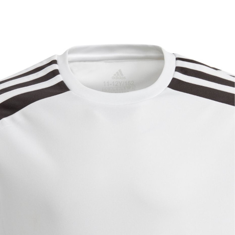 Dziecięca koszulka treningowa adidas Squadra 21 JGN5738 w białym kolorze z systemem Aeroready odprowadzającym wilgoć. Zaprojektowana z recyklingowego materiału. Uniwersalny design z paskami i logo. Idealna dla sportowców i początkujących.