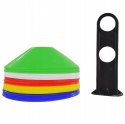 Zestaw 50 pachołków talerzyków z giętkiego PVC w różnych kolorach z dodatkowym stojakiem. Praktyczne narzędzie do treningów sportowych i zajęć szkolnych.