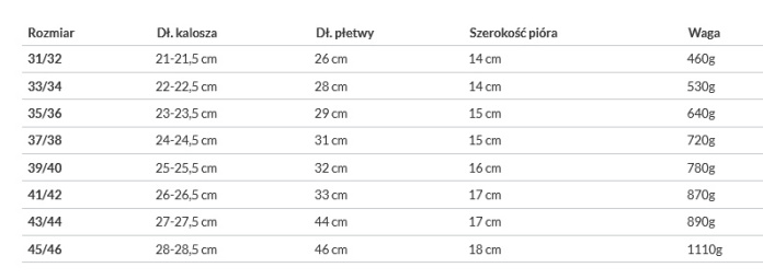 - Specjalne wzmocnienia: Znajdują się po bokach płetw i rozpoczynają już przy kaloszach, gwarantując wytrzymałość oraz kierując wodę wzdłuż piór, co redukuje wibracje wywołane zawirowaniami wody.