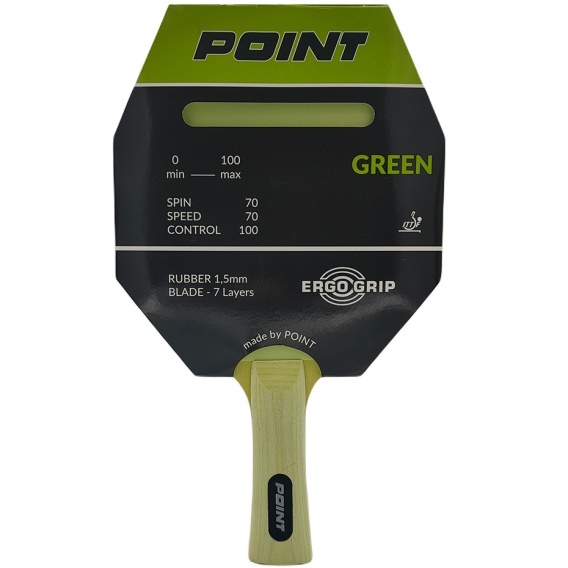 Rakietka do tenisa stołowego Point Green to model stworzony z myślą o zawodnikach klubowych. Wyposażona w 7-warstwową konstrukcję, miękką okładzinę o grubości 1,5 mm i technologię Ergo Grip, zapewnia niezwykłą kontrolę nad piłką. Posiada certyfikat ITTF i nadaje się zarówno do treningów klubowych, jak i rozgrywek towarzyskich.