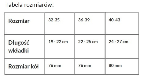 - Wymiar kół: rozm. 32-35, 36-39: 76 mm, rozm. 40-43: 80 mm