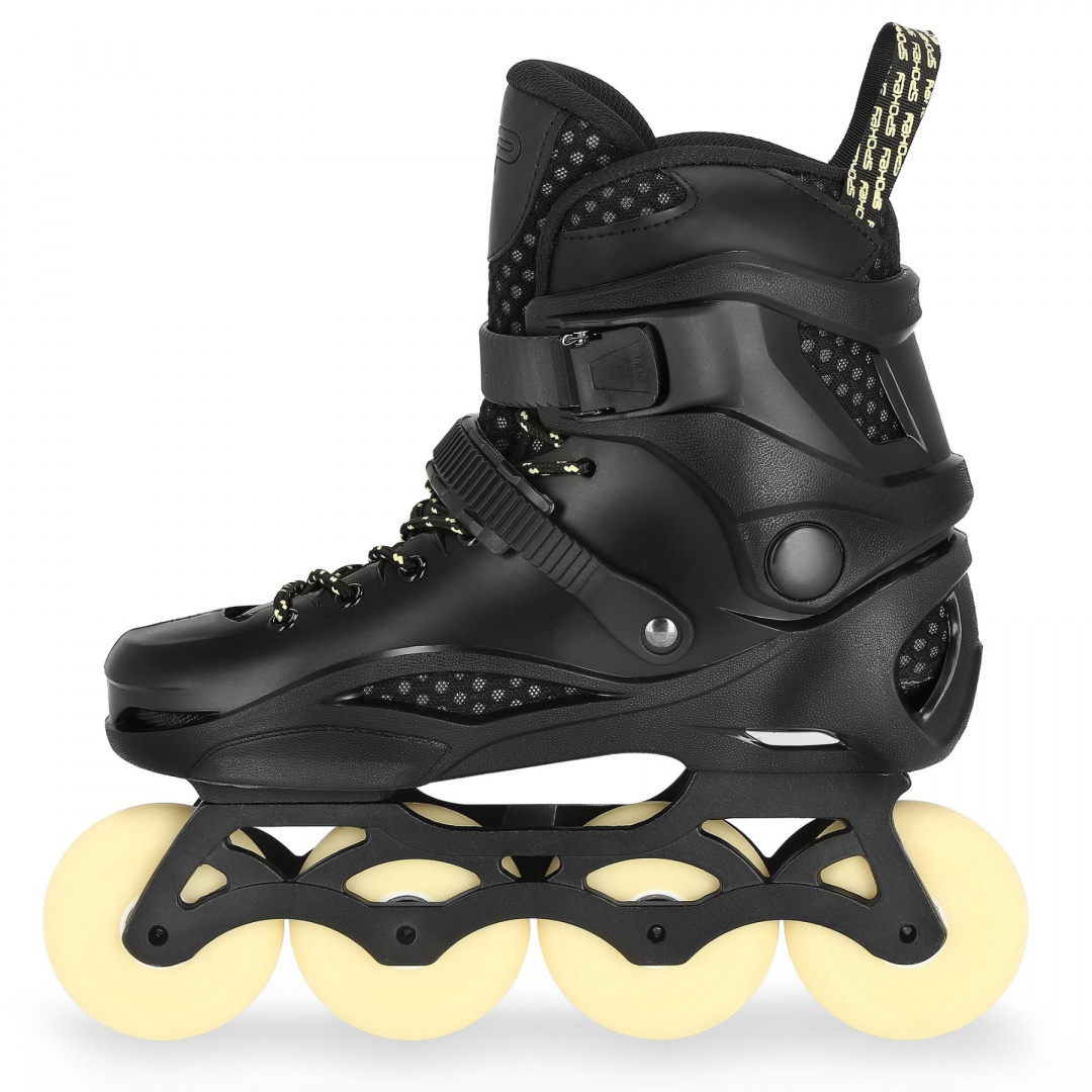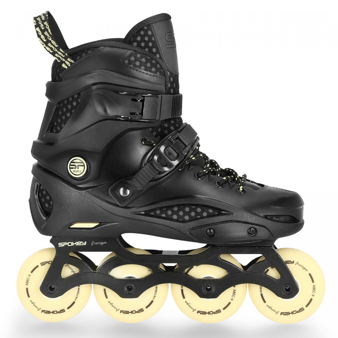 Rolki Spokey FREESPO to połączenie komfortu jazdy oraz najlepszych parametrów technicznych. Zastosowanie twardej skorupy, wykonanej z PP* (wysoce elastyczny polipropylen), zapinanej na dwie klamry (górną klasyczną oraz dolną z pompką zaciskową) oraz sznurowadła, zapewnia optymalne dopasowanie buta do stopy. Zmniejsza to ryzyko doznania kontuzji i jednocześnie umożliwia perfekcyjne kontrolowanie manewrów i skrętów podczas jazdy. Konstrukcja Freespo niweluje także błędy, które często pojawiają się u początkujących skaterów, takie jak np. koślawienie kostek.