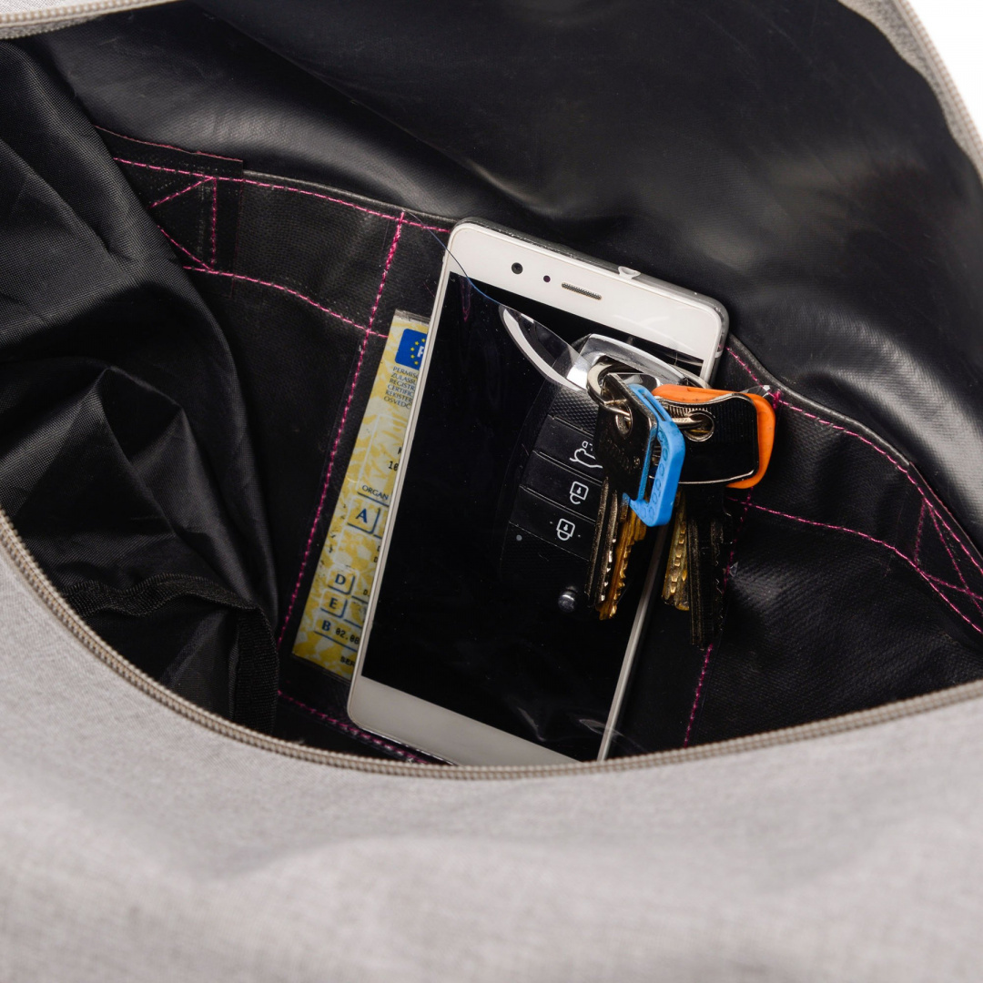 Torba posiada kieszeń główną, w której dodatkowo mieści się przezroczysta kieszonka na smartphone'a, klucze lub inne cenne przedmioty o wymiarach około 11,5 x 14,5 cm. Boczna kieszeń np. na buty, znacznie ułatwia organizację miejsca. Dzięki takiemu rozmieszczeniu kieszeni, zawsze bez problemów znajdziesz to, czego w danej chwili będziesz potrzebować.