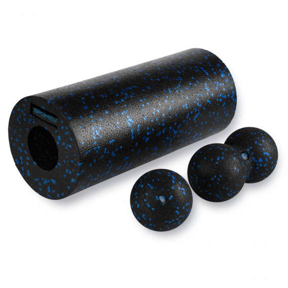 W zestawie znajdziesz: roller duży (33 x 14 cm), piłka do masażu (8 cm), podwójna piłka do masażu (8 x 16 cm).